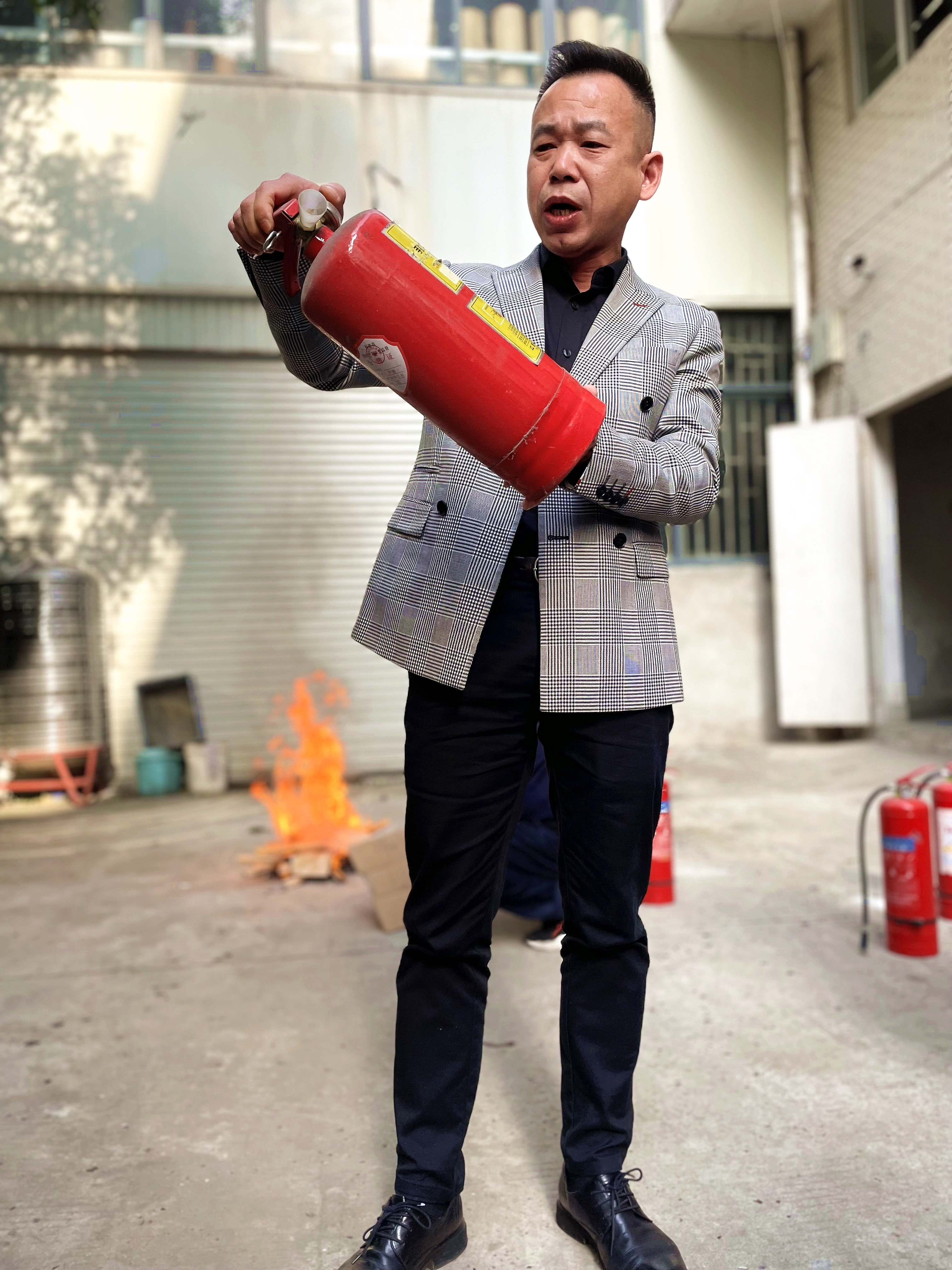 演練開始前,廠長(zhǎng)聶秋光首先向大家講解了消防專業(yè)知識(shí)、滅火原理、滅火器類型及使用等基本消防知識(shí)和演練注意事項(xiàng),演示了正確使用滅火器的方法、滅火步驟與動(dòng)作要領(lǐng):公司安全員點(diǎn)燃了提前放置好的柴火堆,聶廠長(zhǎng)手提滅火器跑向火場(chǎng),在距火焰3米左右的地方,提起滅火器上下?lián)u動(dòng)后拔掉保險(xiǎn)保險(xiǎn)銷,右手用力壓著壓把,左手拿著噴管左右擺動(dòng),對(duì)準(zhǔn)燃燒正旺的火點(diǎn)根部進(jìn)行噴射,滅火器噴出的干粉覆蓋整個(gè)燃燒區(qū),迅速將明火熄滅。